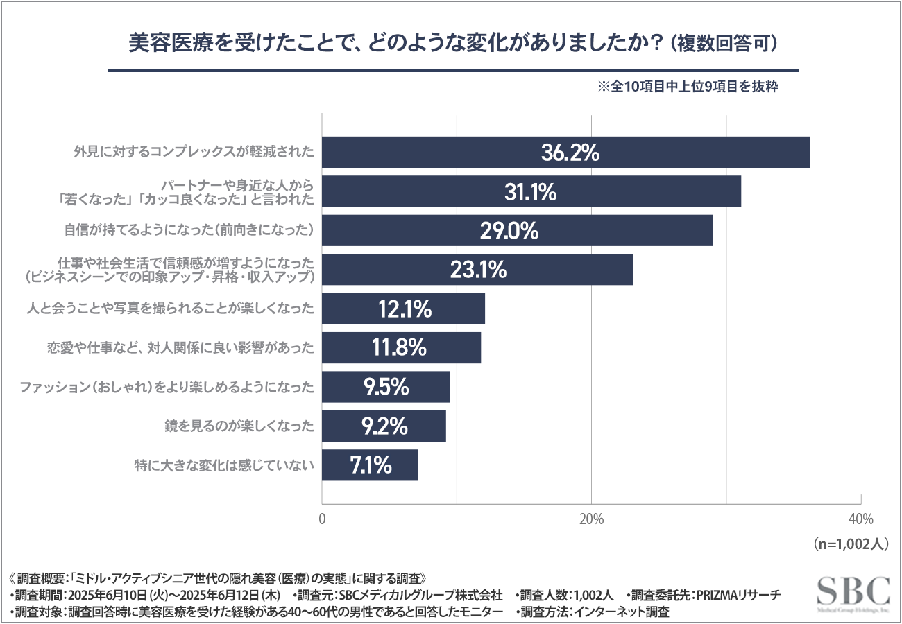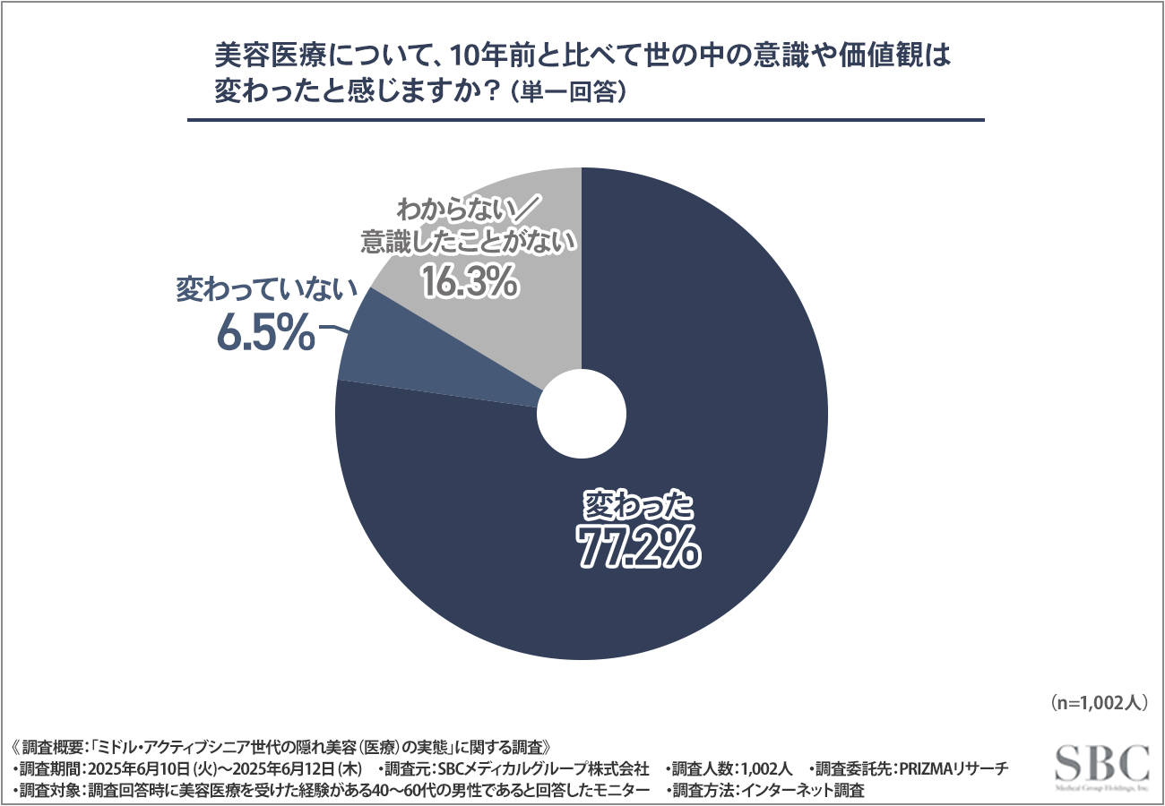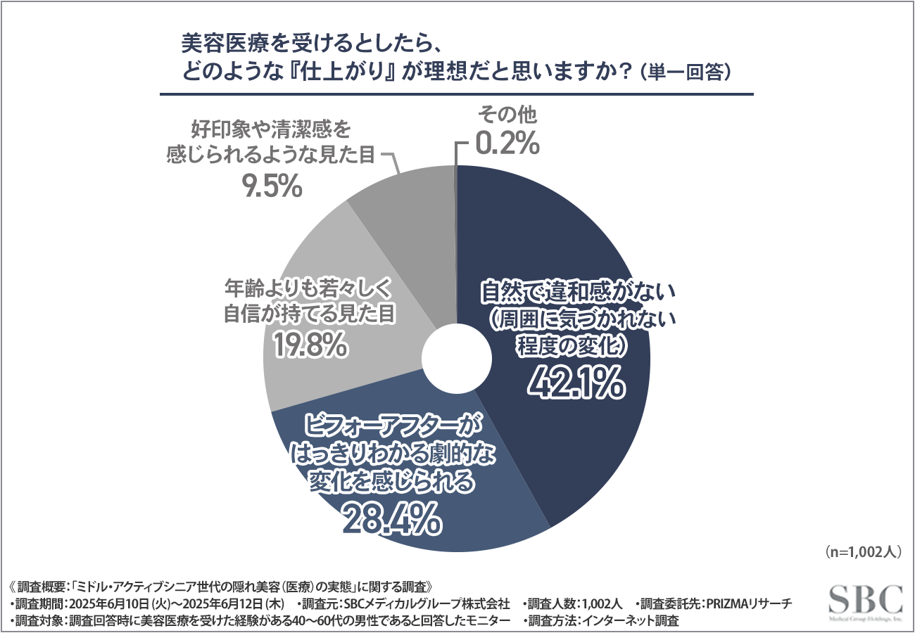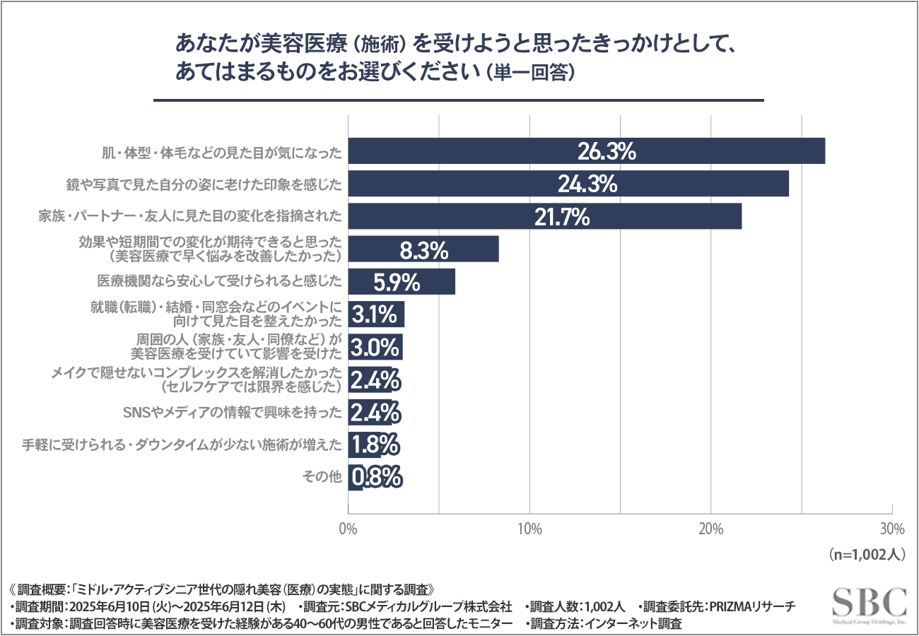 SBCメディカルグループホールディングス(米国カリフォルニア州、CEO:相川佳之)の連結子会社であり、全国の医療機関への経営支援を展開するSBCメディカルグループは、これまで美容医療を受けたことがある40〜60代 ミドル・プレシニア世代の男性1,002名を対象に、美容医療を始めたきっかけ、理想とする仕上がり像、関心の高い施術、施術を受けた自身の変化、そして過去10年での価値観の変化などについての意識調査を実施しました。